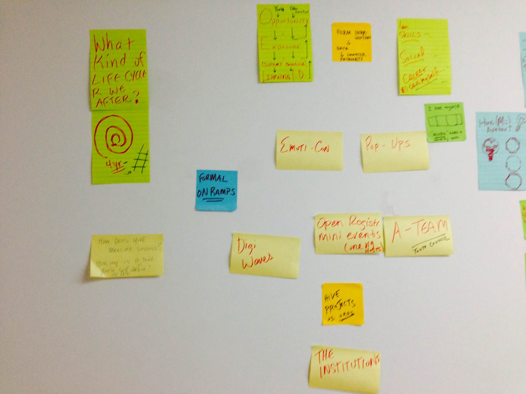 Ideating – Taking what’s developed in the backgrounding phase of the charrette, Hive members involved will be brainstorming and developing lots of ideas that might be experimented with in order to tackle these problems, and figure out which are pie in the sky and which might be viable given the right resources and stakeholder buy-in.