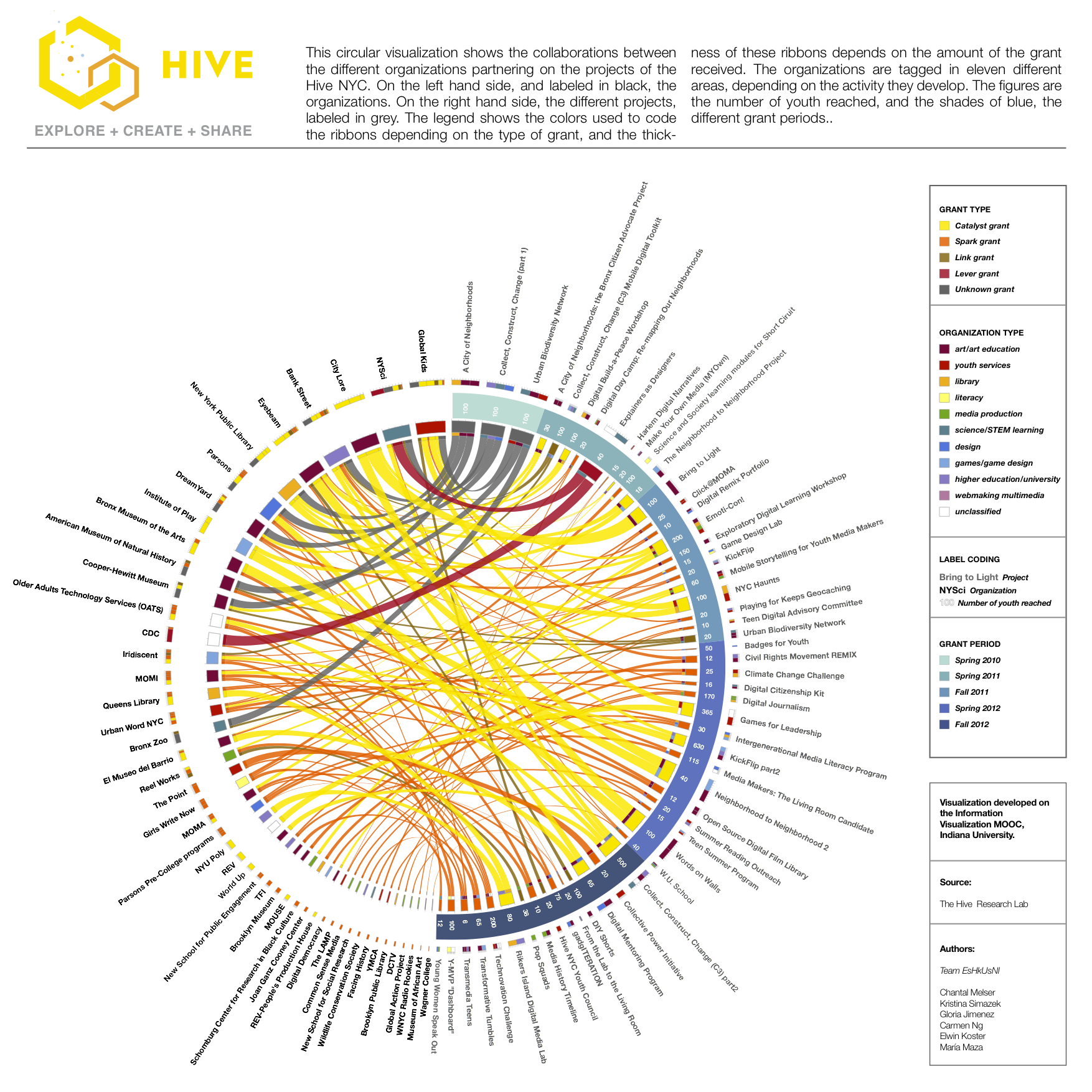 This past Spring, members of Hive Research Lab worked with students in Indiana University’s IVMOOC, an online information visualization course, to take data about Hive NYC-funded projects and partnerships and see what sorts of interesting patterns might emerge through different visualization techniques. In this two part series, we interview each of the two teams of students  that worked with the data to have them share their process, the visualizations they came up with, and reflections on what it was like working with Hive NYC data.